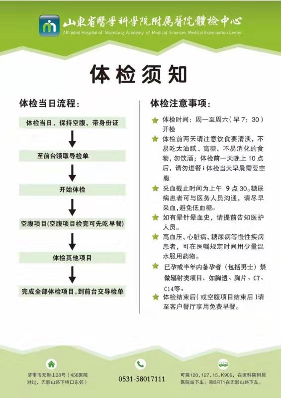 (二)體檢地點:山東省醫(yī)學科學院附屬醫(yī)院體檢中心(位置:濟南市無影山38號(456醫(yī)院對面)1號樓查體中心);